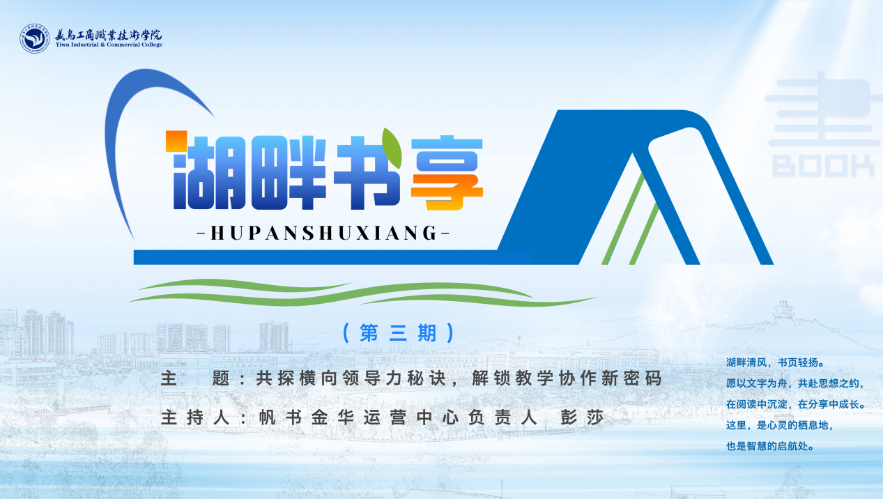 6月10日下午,“湖畔书享”读书沙龙第三期于图书馆圆满举办。图书档案中心与BEAT365英国官网联合特邀帆书金华运营中心负责人彭莎担纲主持,以哈佛大学经典著作《横向领导力》为切入点,紧密结合师德师风专项整治要求,带领教师群体探索非职权领导力在班级管理、团队协作及学生育人中的实践路径。